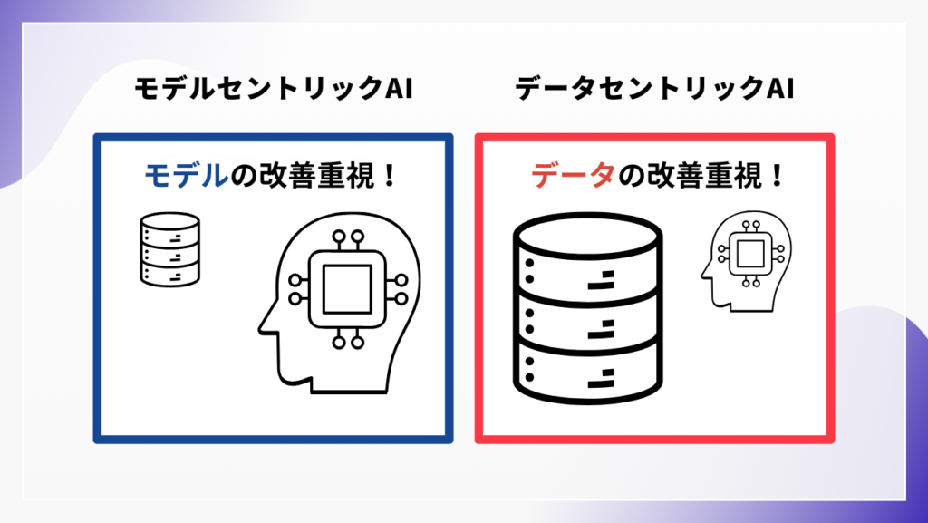 これまではモデルセントリックAIという考え方がAI開発の主流となっていました。つまり、データを固定し、AI機械学習モデルのアルゴリズムやハイパーパラメータの調整などを行い、モデルの改良を行うことでAIの精度を向上させようとする考え方です。